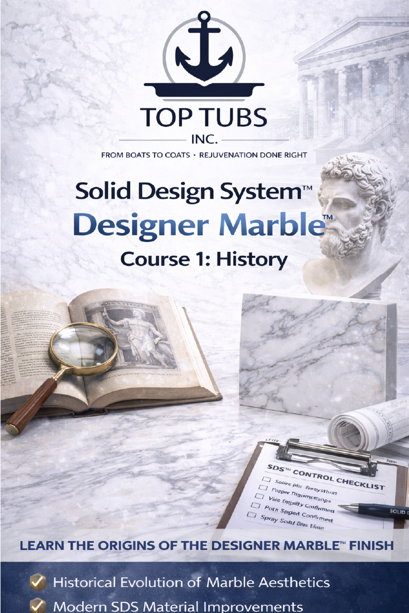 Introductory training on the origins and evolution of the Designer Marble™ finish within the SDS framework. Covers material development, surface aesthetics, and how historical methods translate into modern SDS application standards. Establishes the foundation for controlled, high-end finishes using the Solid Design System™.